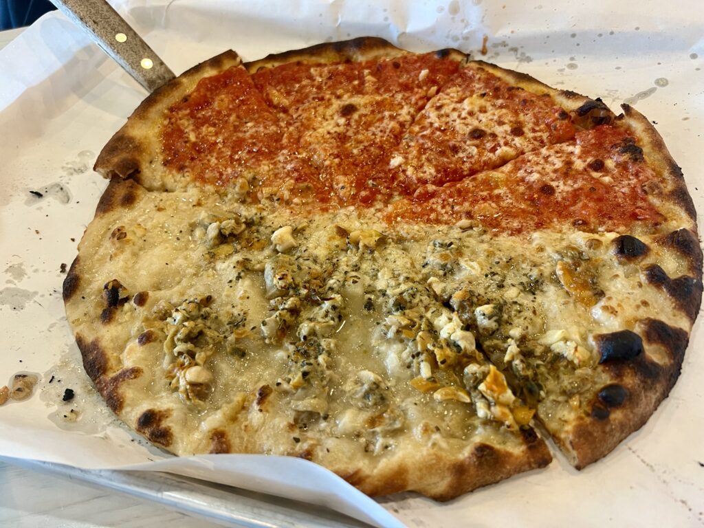 Half white clam and half original tomato pie at Pepe’s in West Hartford. Photo credit: Ronni Newton