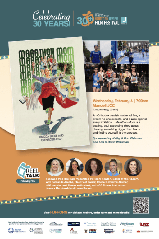 - I’m honored to have been asked to moderate a “Reel Talk” following a screening of “Marathon Mom” at the 30th Annual Phyllis Hoffman Hartford Jewish Film Festival this week. The screening of the 90-minute documentary begins at 7 p.m. on Wednesday, Feb. 4 at the Mandell JCC, and panelists include Fleet Feet owner Fernanda Jacobs, JCC member and fitness enthusiast Rachel Leventhal-Weiner and JCC fitness instructors Jessica Macdonald and Laura Barash. For more information, or to purchase tickets for the film, visit the website hjff.org or use the QR code on the poster below.