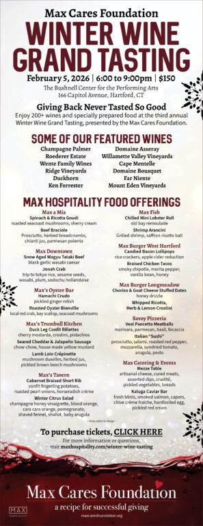 - Also happening this week is Max Cares Foundation’s Winter Wine Tasting! The event, held at The Bushnell, features more than 200 wines paired with food from each of the Max restaurants.