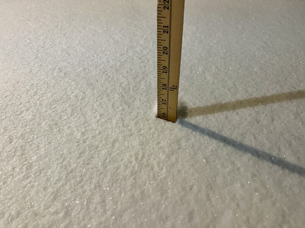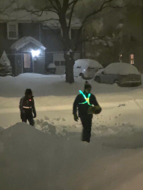 I will add that Ted and I ventured out to my sister’s house for dinner on Sunday night, lured by the prospect of homemade ziti prepared by her boyfriend, Carmine Mancini. She only lives a half mile away and we walked – with high-viz accessories, of course! When we got home around 9 p.m., I measured between 15 and 16 inches of snow in places that had previously been bare and where it hadn’t really drifted.
