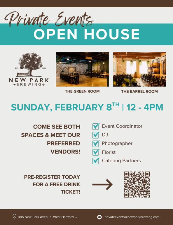 - New Park Brewing (485 New Park Avenue) will be holding an open house on Sunday, Feb. 8, that will include a tour of both of their private event spaces. Their preferred vendors, including a florist, a DJ, and event coordinator, a photographer, and catering partners participate in the event. “Visit each vendors’ booth to see their work while tasting some yummy bites! Cash bar available & one free drink ticket to those who pre-register,” New Park Brewing said in an announcement. More details and the link to registration can be found here.
