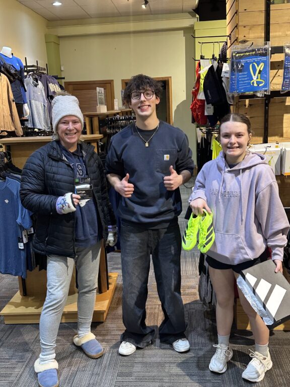 First customer at Fleet Feet Glastonbury was a Portland High School freshman (right) with her mom. Center is the Jacobs’ son, David, who handled the sale. Courtesy photo