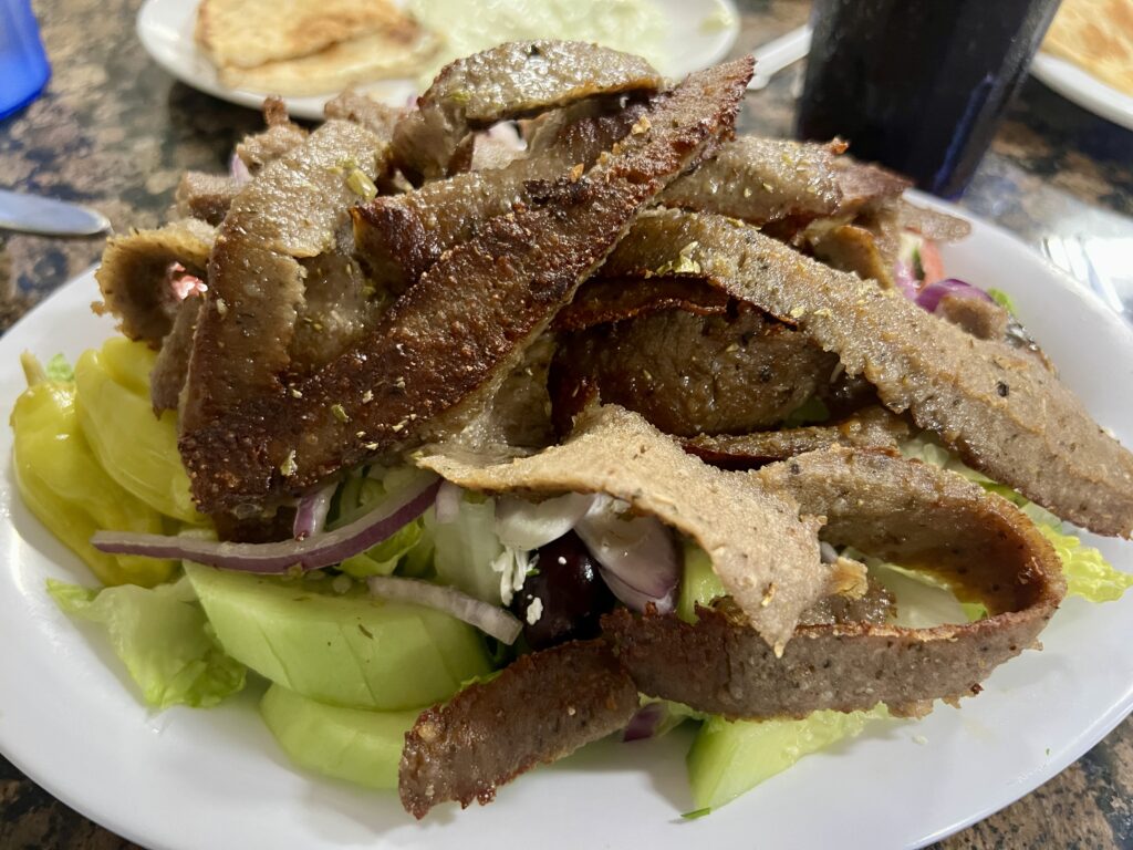 Gyro salad at Chris’ Taverna, Lake Worth, FL. Photo credit: Ronni Newton