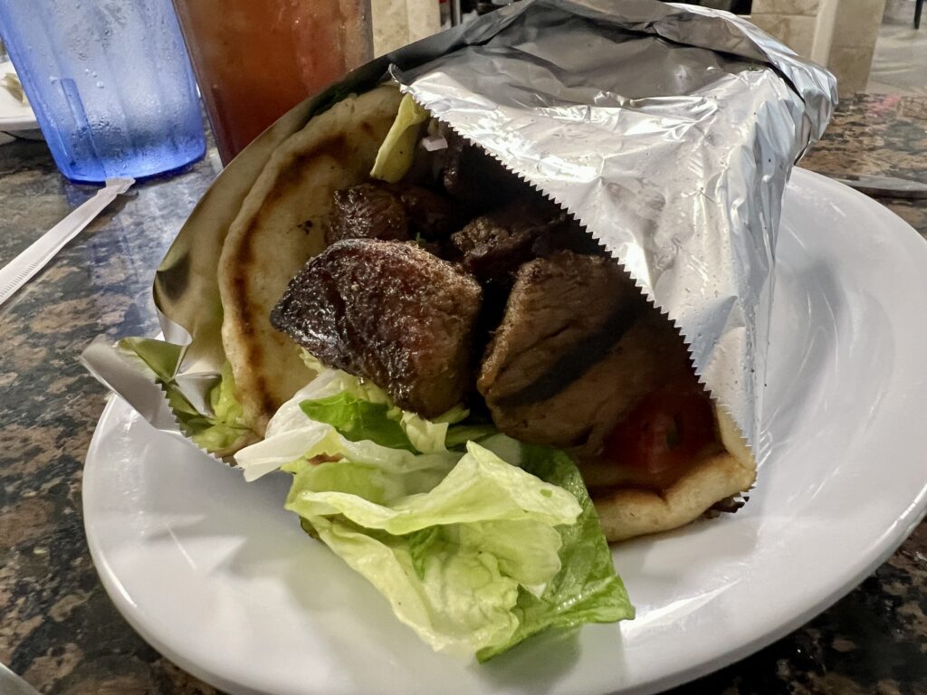 Souvlaki wrap at Chris’ Taverna, Lake Worth, FL. Photo credit: Ronni Newton