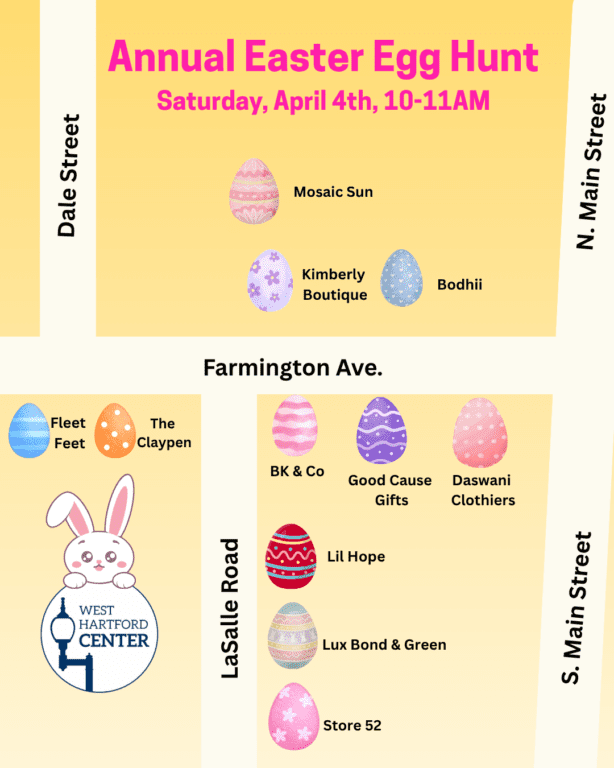 - West Hartford Center will host their annual egg hunt on Saturday, April 4, from 10-11 a.m. “Come celebrate spring in The Center by finding eggs filled with candy and prizes at all participating stores,” said West Hartford Center Business Association President Kimberly Mattson Moster. “Find an egg in every color (8 total) and bring your complete set to be entered to win one of two $100 gift cards to be used anywhere in The Center,” she said. Eggs will be available while supplies last and the drawing will happen at 11:15 a.m. on Saturday just inside Fleet Feet. Participating stores include Mosaic Sun, Kimberly Boutique, Bohdii, Fleet Feet, The Claypen, Store 52, Lux Bond & Green, BK&Co, Good Cause Gifts, Daswani, and Lil Hope.