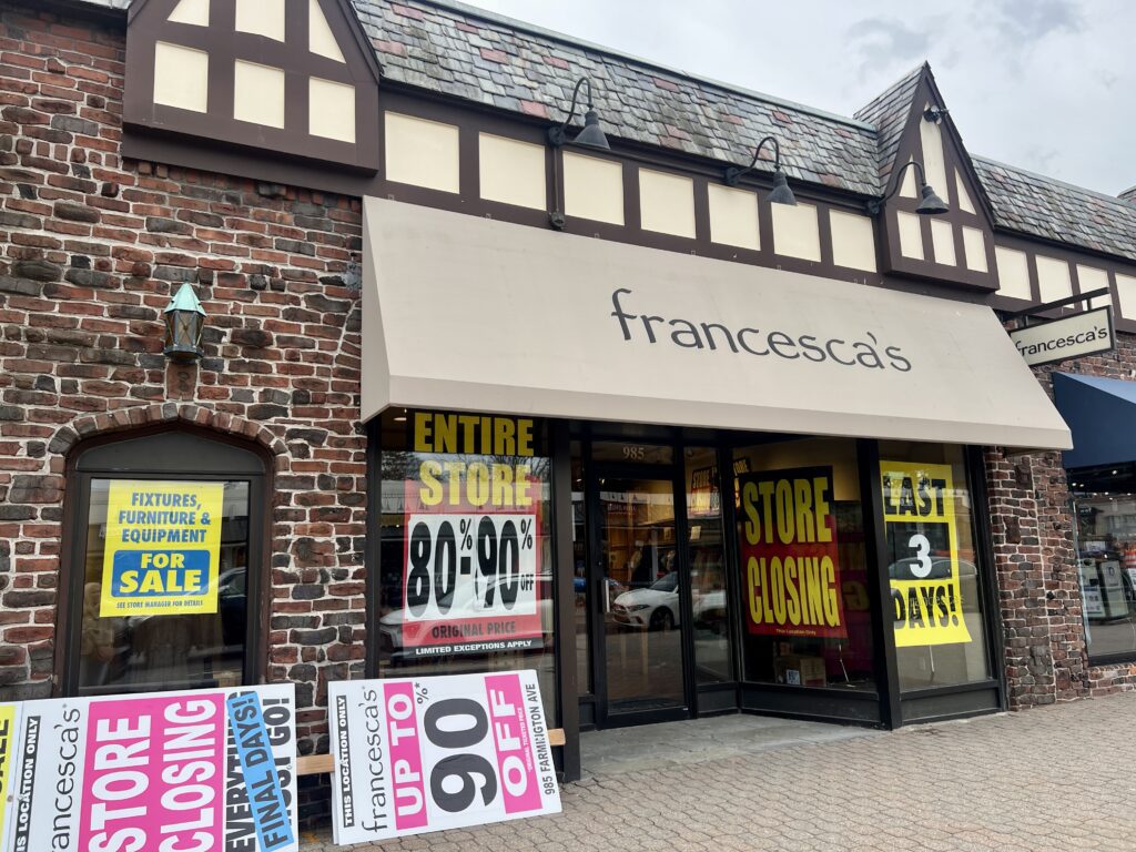 - There was a sign in the window of Francesca’s (985 Farmington Avenue) on Friday indicating three more days until in business. By the time you read this, the store will be closed for good – part of a nationwide going-out-of business sale.