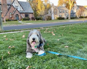 millie on lawn with leash