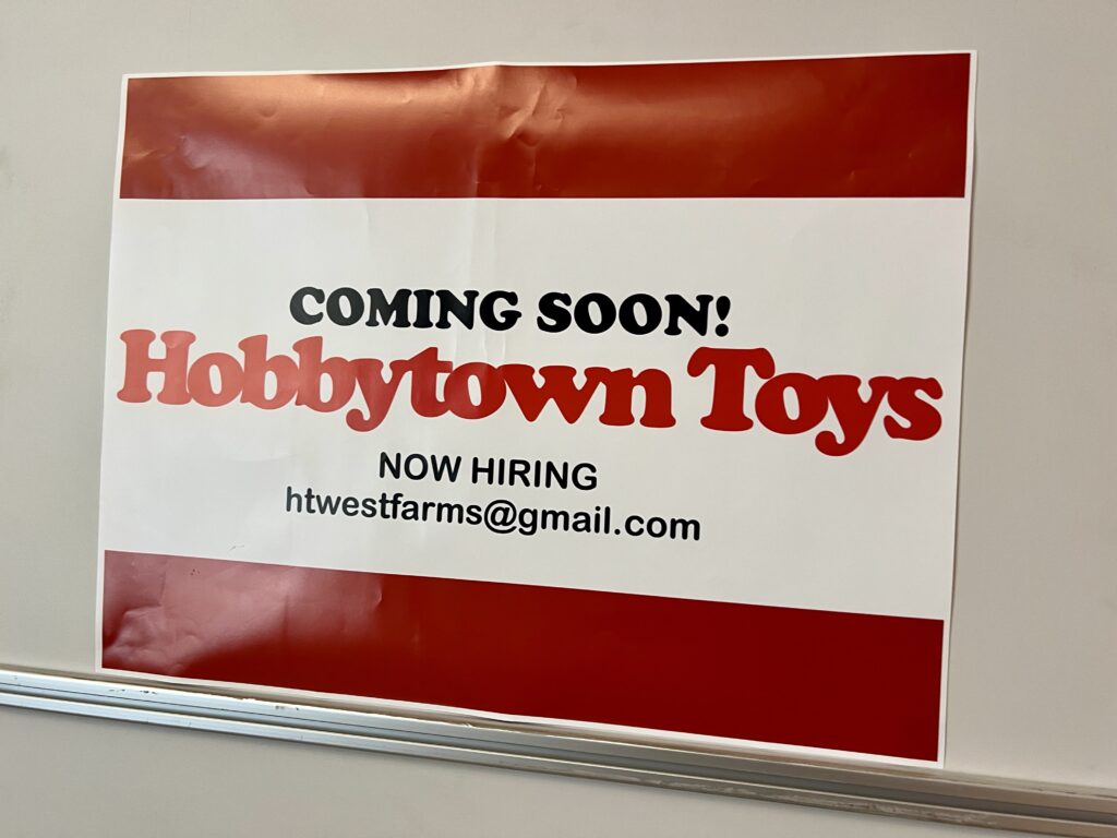 A sign on the barrier indicates that Hobbytown Toys is coming soon, and will be located on the lower level of Westfarms in the California Pizza Kitchen wing (former GameStop store). Photo credit: Ronni Newton