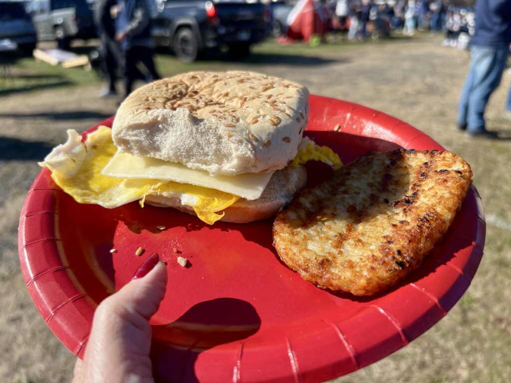 Egg sandwich and hash browns cooked on the grill at the UConn tailgate. Photo credit: Ronni Newton