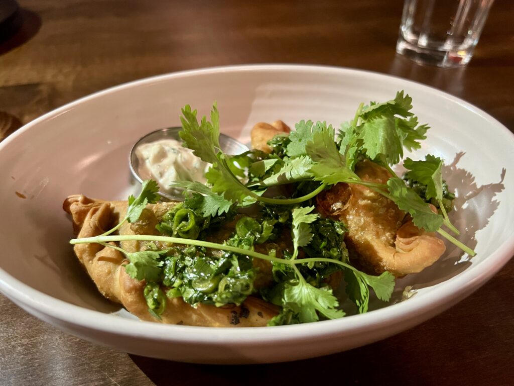 Vegan empanadas (plant-based Argentinian empanada, chimichurri “aioli,” cashew) at The Laurel. Photo credit: Ronni Newton