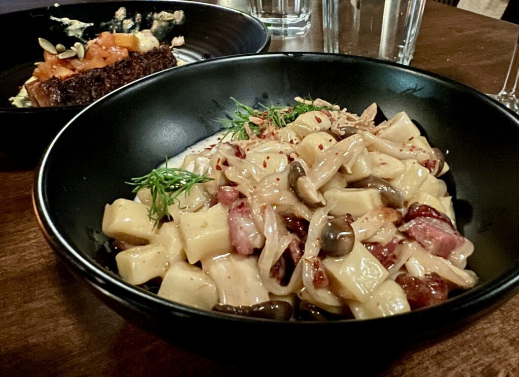 Haluski Pasta (Ukrainian pasta, Bella Bella duck bacon, Seacoast mushrooms, onion soubise) at The Laurel. Photo credit: Ronni Newton