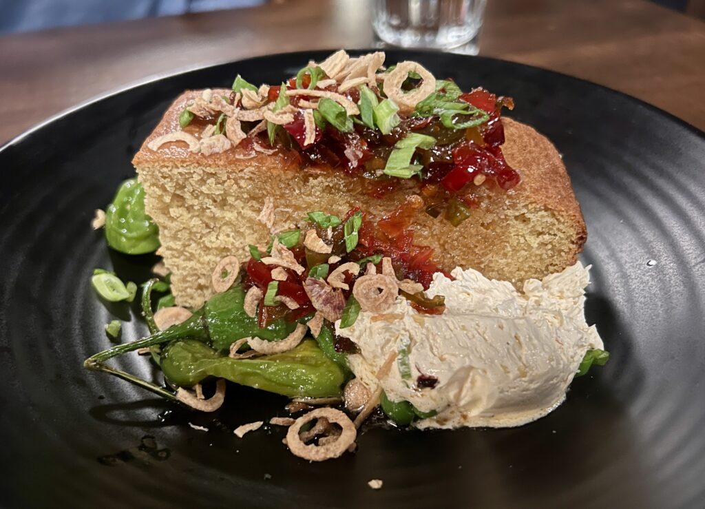 Cornbread (Young Farms corn flour, red pepper jelly, pimento butter, roasted shishitos) at The Laurel. Photo credit: Ronni Newton