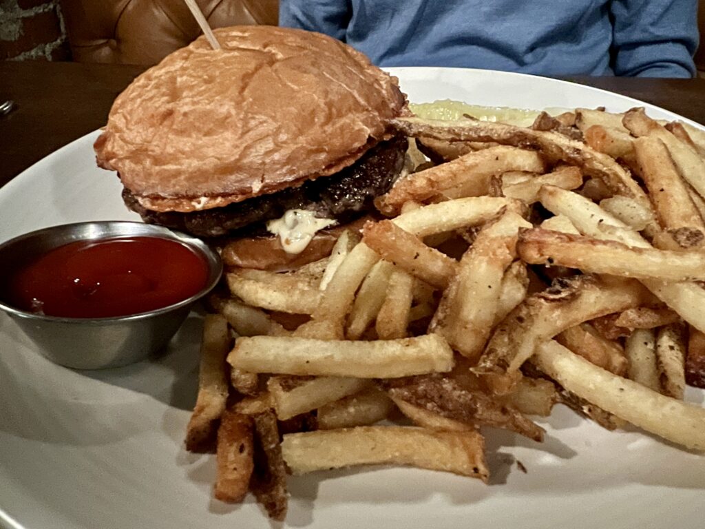 Griddled burger (pimento cheese, dill pickle remoulade, crispy cheddar cheese brioche bun, handout fries) at The Laurel. Photo credit: Ronni Newton