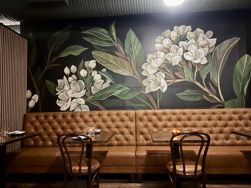 - When The Laurel opened in the former Corner Pug space (1046 New Britain Avenue in Elmwood) last January, Ashley Flagg, who co-owns the restaurant with her wife, Rebekah Flagg, said that the next step would be transforming the separate room on the west side of the building for private dining and event space. And while they are still putting the finishing touches on the walls, the renovated room is ready for use! The walls, floor, and tin ceiling have all been given a makeover, and what will likely be a botanical-themed mural by Jaime Jones (who created the mountain laurel mural in the main dining room) is coming as soon as possible to the blank space on the far wall. “The room can accommodate 40 people,” Ashley said, for anything from cocktails to three- or four-course formal meals, to family-style dining. They have a few holiday parties already booked, and Ashley noted that they can also host events on Mondays or Tuesdays (when they are otherwise closed) and hold buy-outs in the main part of the restaurant. For the new room credited Rebekah (who designed the rest of the space) for the visual inspiration, including the choice of “Dark Forest” as the paint for the lower part of the walls, and “Laurel Woods” for the tin ceiling paint. “It’s exciting,” she said of reaching this next phase of the business. I timed my tour of the new event space – where there were a few tables of people eating dinner – to coincide with a Saturday night dinner. It had been way too long since Ted and I had a full dinner at The Laurel but we definitely won’t wait that long again. The menu changes seasonally, based on locally available ingredients, and other than the griddled burger we ordered items that we had never tried before – all of which were exquisitely delicious! As I said in the introduction above, we had a hard time deciding so we ordered way too much, but I’m also a big fan of leftovers.
