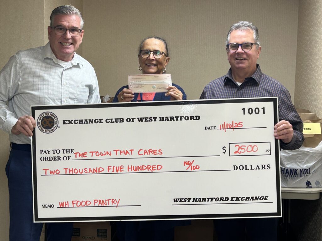 - Patrick Daly (left) and Shawn Richard (right) recently presented a check for $2,500 to the West Hartford Food Pantry on behalf of the West Hartford Exchange Club. Tullulah Pickens, the program coordinator (center), accepted the check and expressed her appreciation for all the Exchange Club has done over the years for the Food Pantry.