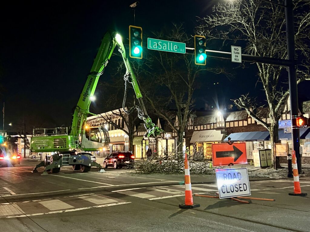 Crews work to cut down the street trees just after 9 p.m. on Monday, Feb. 16, 2026. Photo credit: Ronni Newton