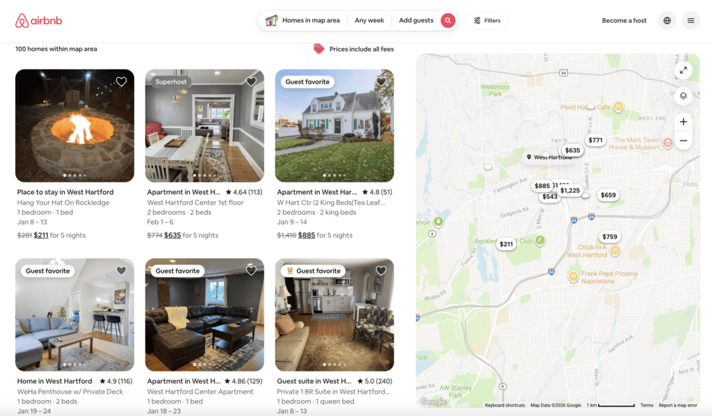 Screenshot of Airbnb search for West Hartford, Jan. 8, 2026
