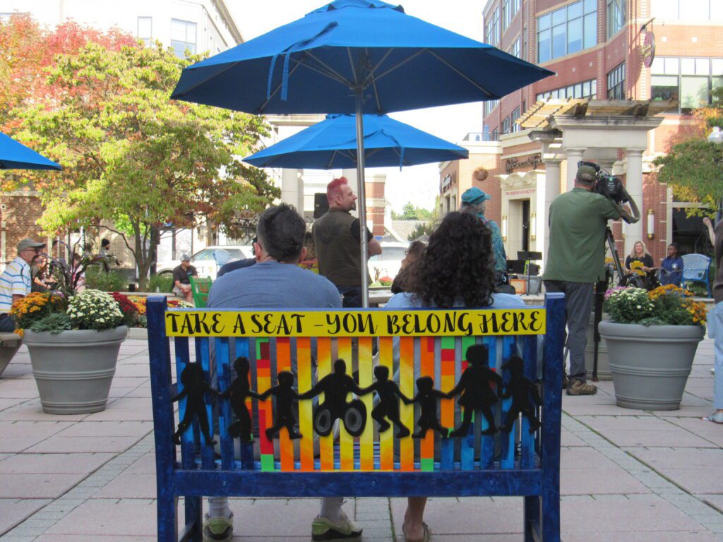 Guests at community mural dedication on a painted Blue Back bench on Sept, 30, 2025. Photo credit: Mia Jaworski