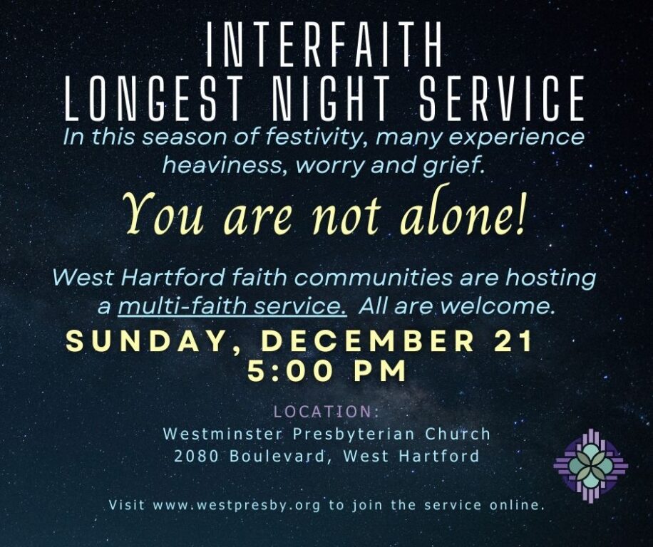 This holiday season, West Hartford faith communities are joining forces to offer comfort and support to the entire community. While the season is often associated with joy and celebration, it can also be a time of heaviness, worry, and grief for many. The Interfaith Longest Night Service will feature words and music of comfort, moments of silence, and opportunities for prayer.