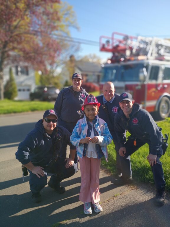 Ava with West Hartford firefighters, her teacher, and the principal at Aiken Elementary School. Courtesy of Candice Kardulis