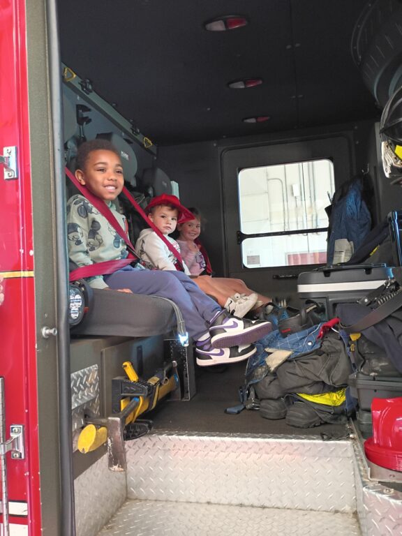 Austin and his friends get to sit in the fire truck. Courtesy of Candice Kardulis