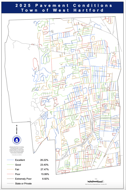 West Hartford has 217 miles of roadways maintained by the town, and on average 8.5 miles are repaved each year, with some of those roadways being fully reconstructed. In 2025, just over 8.6 miles were reconstructed, and between 8 and 10 miles are planned for this year.