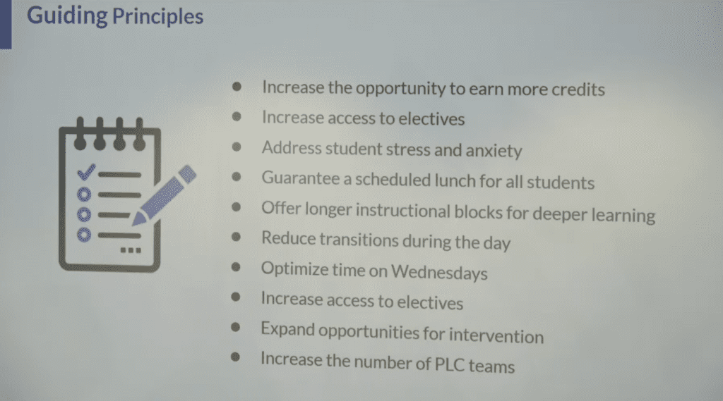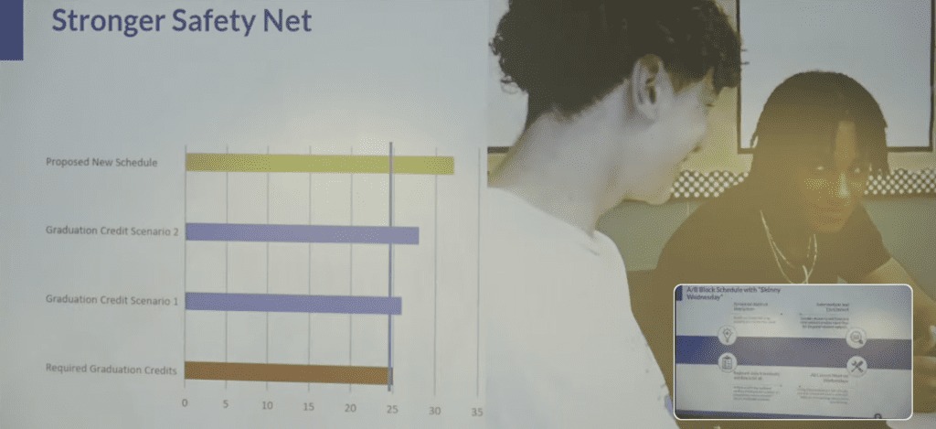While the students have not necessarily come to the administration and asked for block scheduling, the level of anxiety many have been dealing with and the challenge of meeting the graduation requirements point to it as a solution to facilitate deeper learning, personalized attention, and a slowing down of the daily pace. Fewer transitions during the day could decrease the cognitive load and increase equity in access to programs and electives, the team noted.