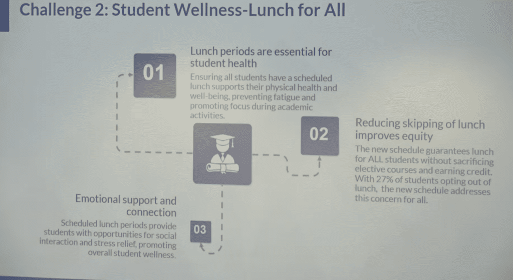 According to Eustis, currently “28% of students do not take lunch,” and the block schedule would require lunch, and allow all high schoolers to have the opportunity to eat lunch in the cafeteria.