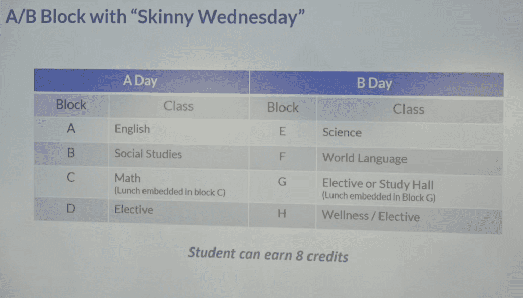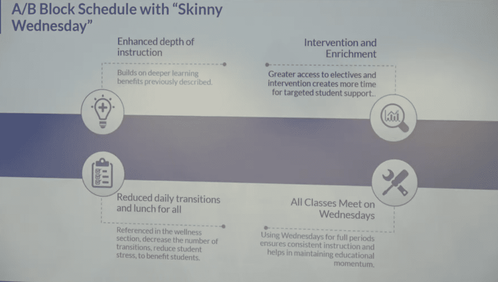 Under the proposed plan, high school students would have four classes of roughly 88 minutes on Mondays, Tuesdays, Thursdays, and Fridays, plus time for lunch, and eight shorter periods with all classes meeting on “Skinny Wednesday.”