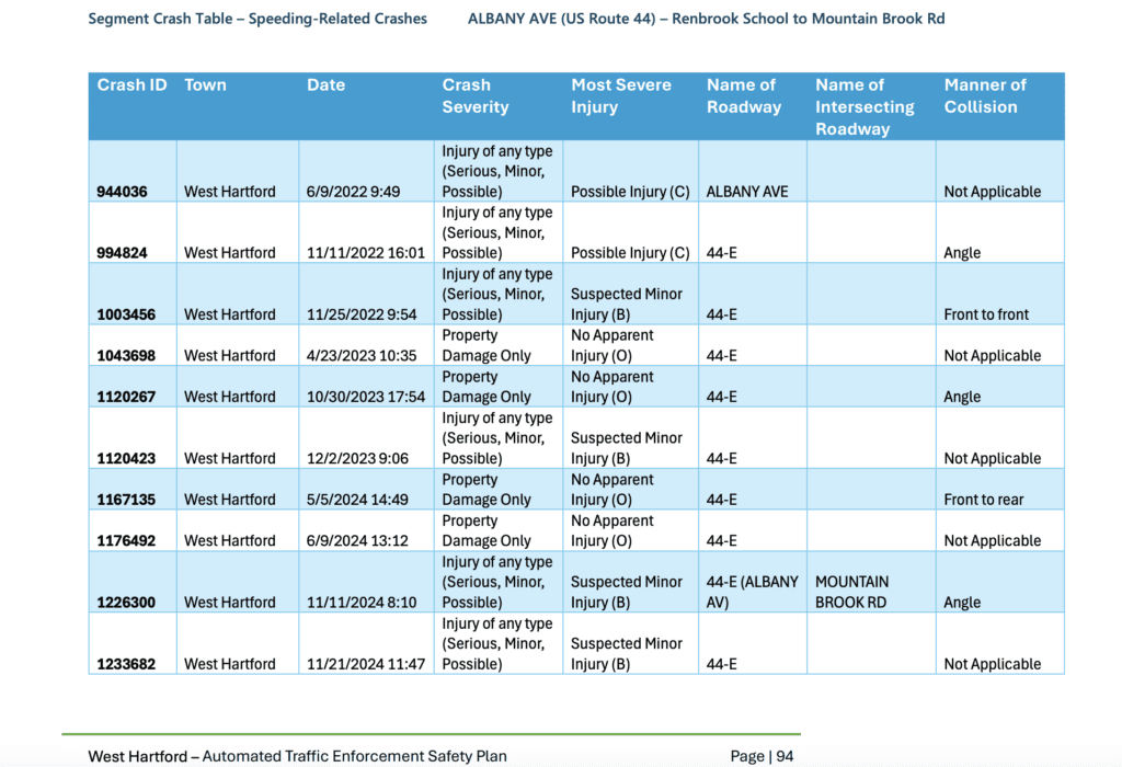 Data provided for one of the speed management camera locations. Town of West Hartford