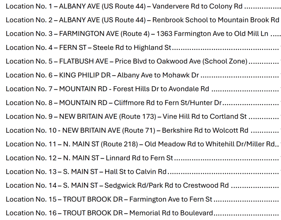 In addition to the three initially declines, Prospect Avenue, between Farmington Avenue and Kane Street, had been identified as an alternate location, Martin said. The state raised concerns because it’s on the border of a qualified census tract where only a certain number of speed management cameras can be located. That location also needed approval by the City of Hartford, which has submitted its own speed management camera program, and Martin said the town agreed to take it out of consideration. He noted that Prospect Avenue is scheduled for repaving this year, and will be restriped with a road diet – which should slow traffic.