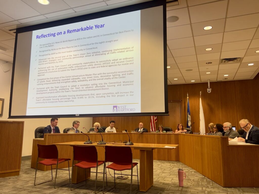 “Before concluding tonight’s presentation, I want to acknowledge something that I am sure is on everyone’s mind.,” Ledwith said. “While this proposed budget reflects financial planning and important investments in West Hartford’s future, we also recognize that any budget increase has a real impact on our taxpayers. We understand that any potential increase in the tax burden is significant for many residents and families, and businesses, and we approach that responsibility with great care and seriousness.”