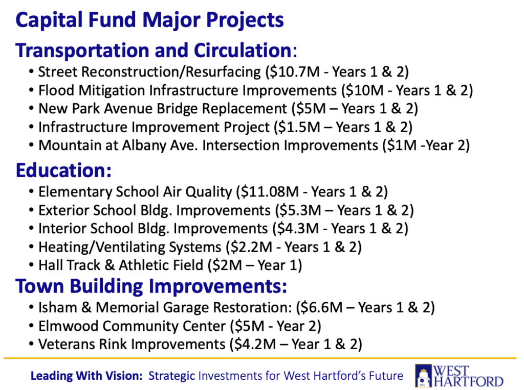 Ledwith said the proposed budget recommendations “are guided by our commitment to Leading With Vision: Strategic Investments for West Hartford’s Future—ensuring that we continue to maintain the high quality of services our residents expect, while also making thoughtful investments in infrastructure, public safety, housing, and community assets that will benefit West Hartford for decades to come.”