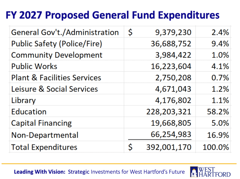 Expenditure categories for FY27. Courtesy Town of West Hartford