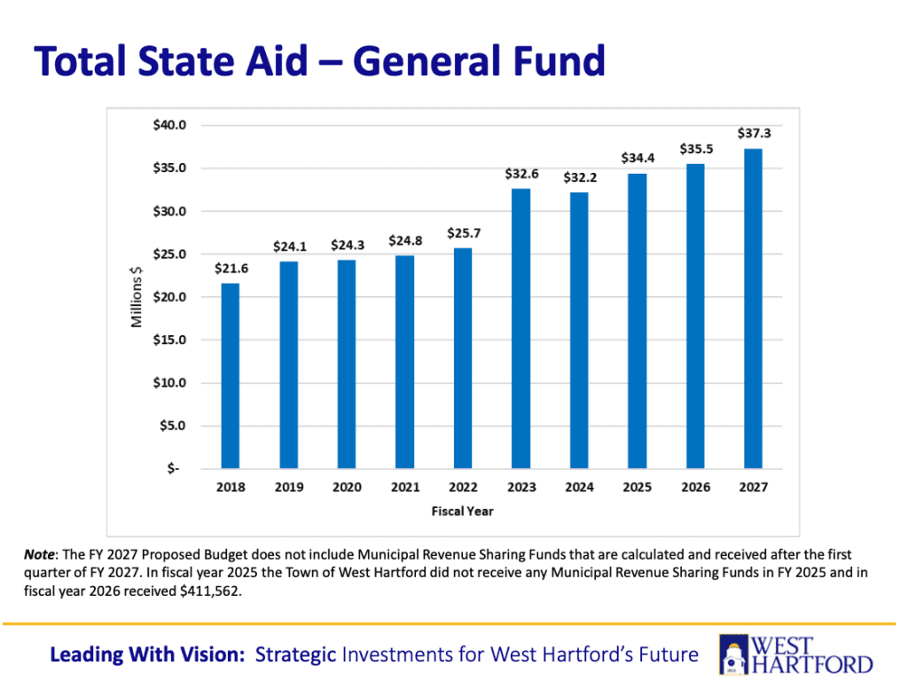 Looking ahead to 2027, the theme of the proposed budget is “Leading with Vision: Strategic Investments for West Hartford’s Future.” Ledwith said the budget recognizes that “West Hartford’s continued success depends on sound financial management and strategic investments that support strong infrastructure, a talented workforce, and a thriving and engaged community. Through responsible and thoughtful planning, the town is advancing initiatives that enhance services, expand housing opportunities, and strengthen community connections. By investing today, we are ensuring West Hartford remains resilient, vibrant, and well-positioned for the future.”