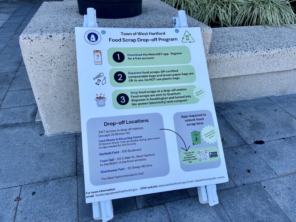 The food scrap collection program has been so successful that the four existing bins installed by the town are consistently full, and being emptied daily during the week, Recycling Coordinator Katherine Bruns said. She’s excited that the Town Council, at its last meeting, approved the use of $119,000 received through the state’s Bottle Bill – fees collected from a five-cent-per-bottle surcharge attached to miniature alcohol containers (nips) sold in West Hartford – in part to expand the number of food scrap collection locations and containers in town as well as the emptying and transportation of the contents.