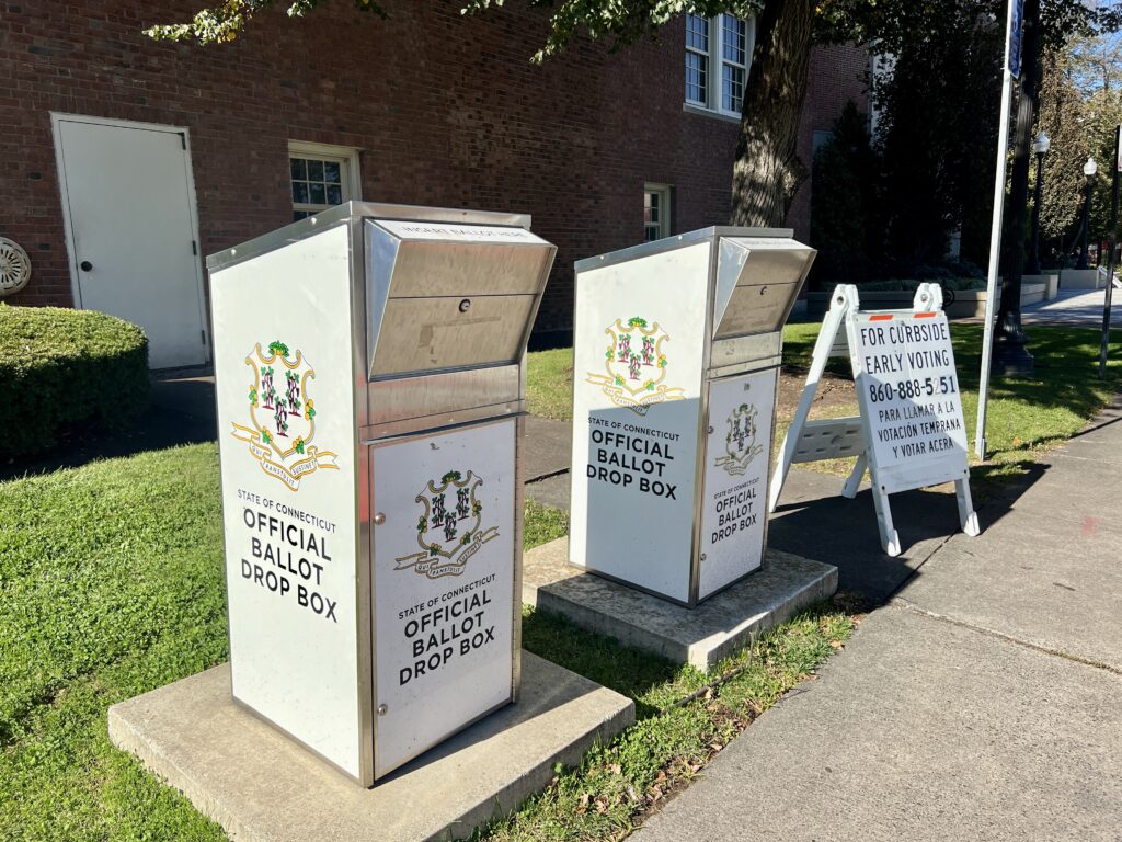 Ballot drop boxes at West Hartford Town Hall. Photo credit: Ronni Newton