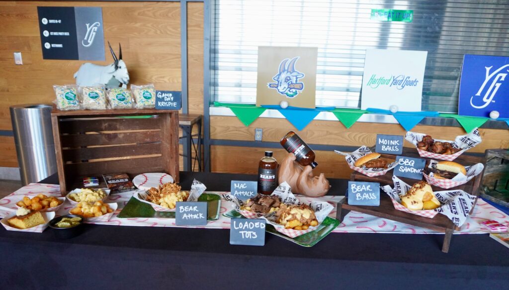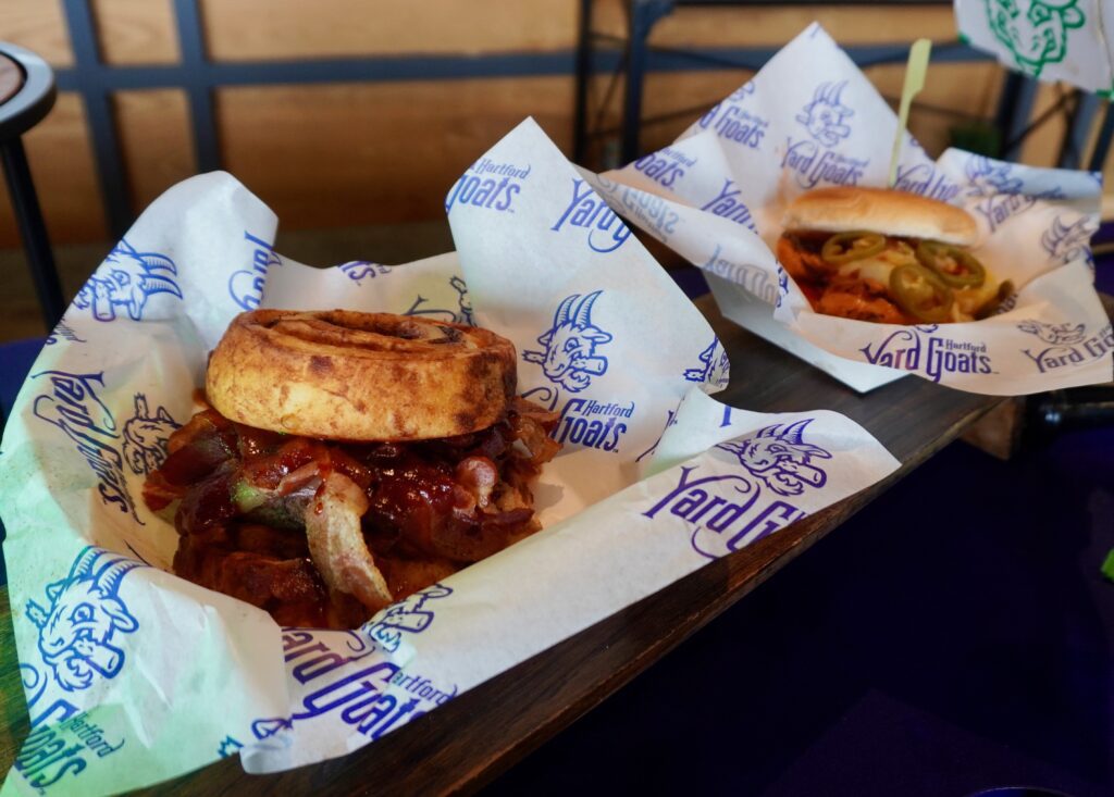 At a media day on Monday, reporters and foodies were given a peek at this year’s menu, which includes roughly a dozen new items as well as returning fan favorites. Bartlett was joined by “Game Day Conor,” who is also the Sponsorship Sales Manager for the Yard Goats; Premium Manager for Catering Tyler Redding; and Cassie Therriault, director of marketing and partnerships for Bears BBQ, which will return to its center field location – as they unveiled this year’s must-try items.