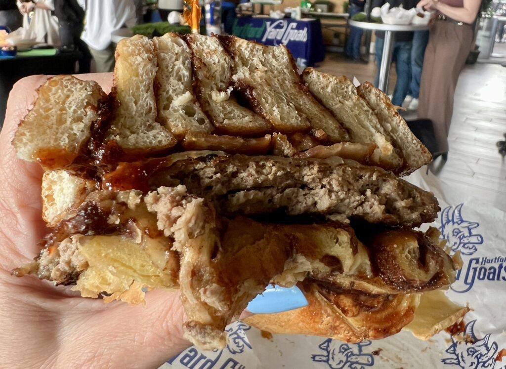 The Cinnamon Bun Burger is among the offerings at Dunkin’ Park during the 2026 Yard Goats season. Photo credit: Ronni Newton